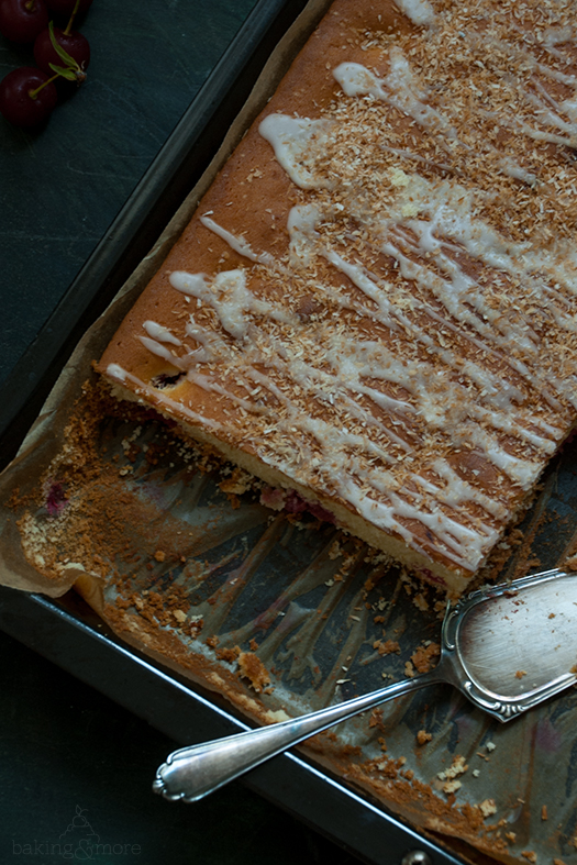 Sauerkirschkuchen mit gerösteten Kokosflocken