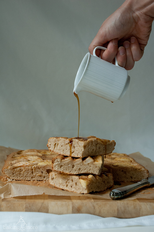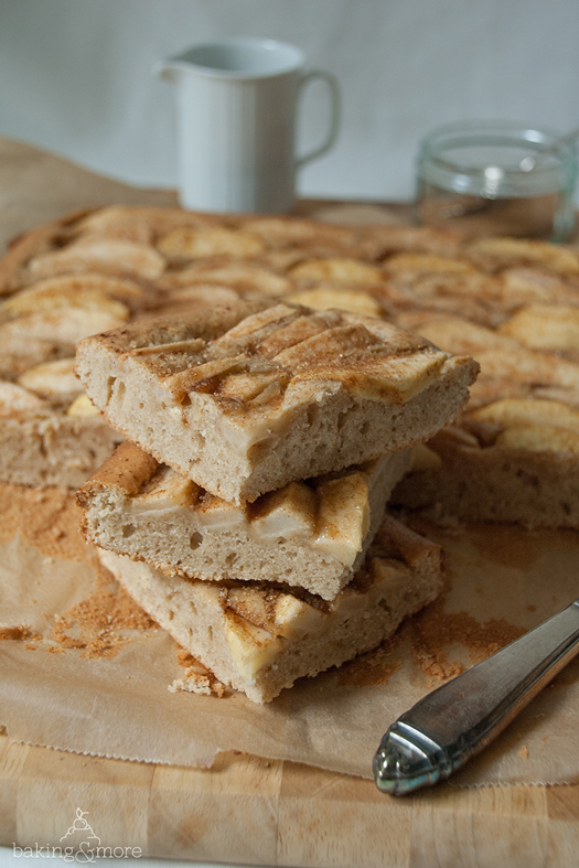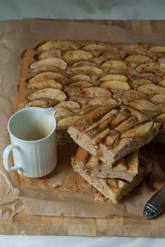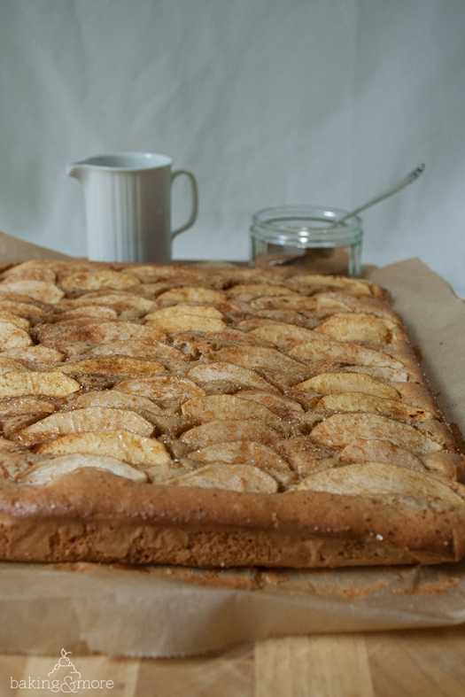 Normalerweise gehört Apfelkuchen für mich eher in die Herbst- und Winterzeit. Als ich vor kurzem aber eine Kiste Äpfel geschenkt bekam musste ich diese natürlich gebührend verwerten. Das hieß natürlich ein neues Apfelkuchenrezept musste gefunden werden. Ich überlegte hin und her und kam schließlich zu dem Beschluss: Ein Apfelkuchen mit Ahornsirup muss es sein! Während des Backens wurde dann noch das Wort „Zimt!!!“ in den Raum geworfen. Ich griff direkt zur „Flasche“ und verfeinerte den Kuchen mit einer zimtigen Note in eine eher winterliche Variante (und das mitten im Sommer). Nach dem ersten Stück des Kuchens, mit einem extra Schuss Ahornsirup oben drauf, kann ich aber mit guten Gewissen sagen, dass dieser Kuchen auch im Sommer ein wahrer Genuss ist!